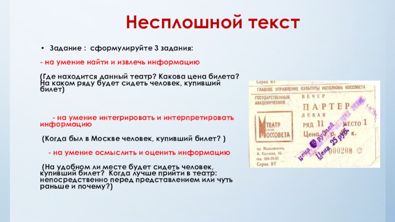 (Где находится данный театр? Какова цена билета? На каком ряду будет сидеть человек, купивший билет)