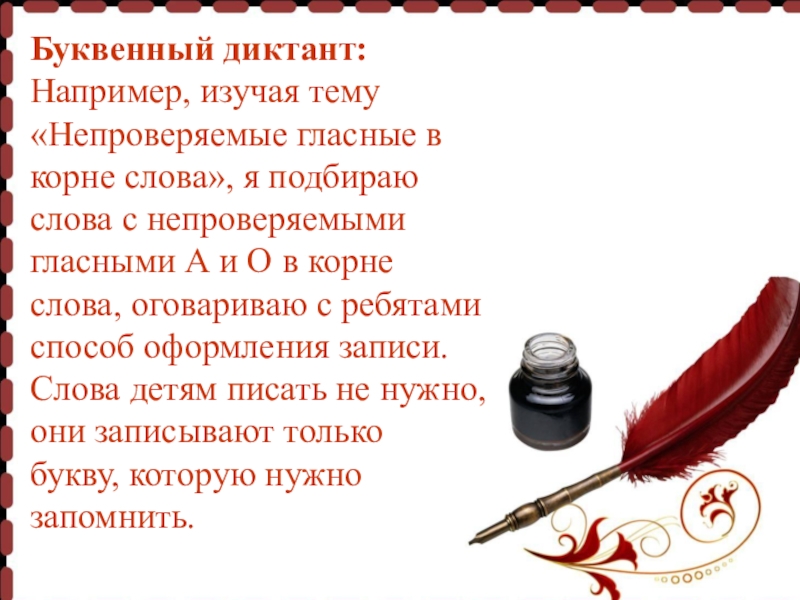 Например, изучая тему «Непроверяемые гласные в корне слова», я подбираю слова с непроверяемыми гласными А и О в корне слова, оговариваю с ребятами способ оформления записи. Слова детям писать не нужно, они записывают только букву, которую нужно запомнить.
