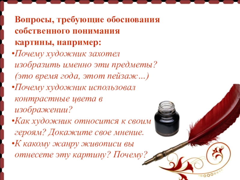 Вопросы, требующие обоснования собственного понимания картины, например: