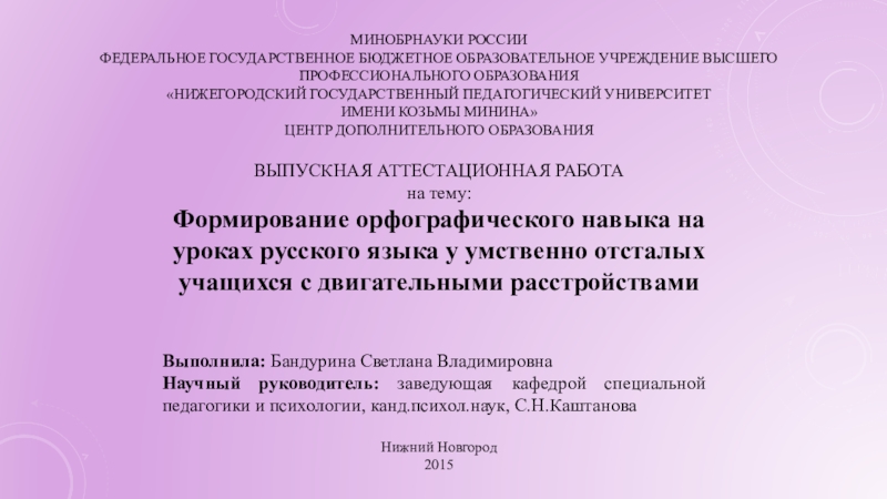 Научный руководитель: заведующая кафедрой специальной педагогики и психологии, канд.психол.наук, С.Н.Каштанова