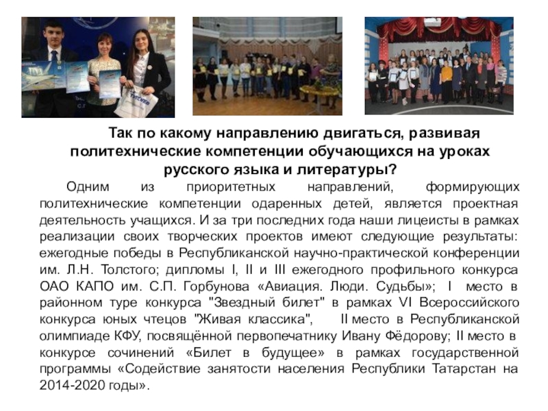 Одним из приоритетных направлений, формирующих политехнические компетенции одаренных детей, является проектная деятельность учащихся. И за три последних года наши лицеисты в рамках реализации своих творческих проектов имеют следующие результаты: ежегодные победы в Республиканской научно-практической конференции им. Л.Н. Толстого; дипломы I, II и III ежегодного профильного конкурса ОАО КАПО им. С.П. Горбунова «Авиация. Люди. Судьбы»; I место в районном туре конкурса "Звездный билет" в рамках VI Всероссийского конкурса юных чтецов "Живая классика", II место в Республиканской олимпиаде КФУ, посвящённой первопечатнику Ивану Фёдорову; II место в конкурсе сочинений «Билет в будущее» в рамках государственной программы «Содействие занятости населения Республики Татарстан на 2014-2020 годы».
