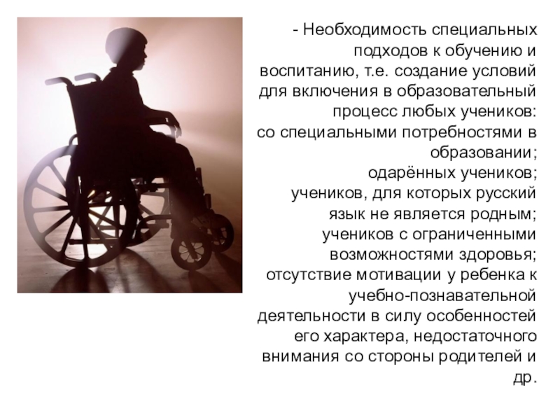 Слайд 4- Необходимость специальных подходов к обучению и воспитанию, т.е. создание условий