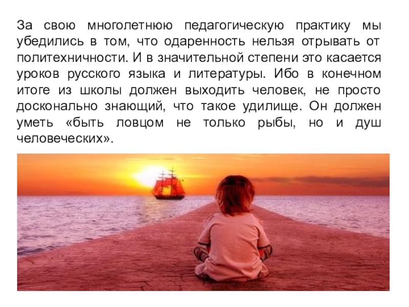 нельзя отрывать от политехничности. И в значительной степени это касается уроков русского языка и литературы. Ибо в конечном итоге из школы должен выходить человек, не просто досконально знающий, что такое удилище. Он должен уметь «быть ловцом не только рыбы, но и душ человеческих».
