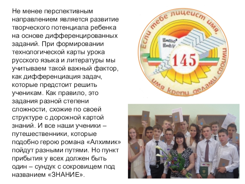 дифференцированных заданий. При формировании технологической карты урока русского языка и литературы мы учитываем такой важный фактор, как дифференциация задач, которые предстоит решить ученикам. Как правило, это задания разной степени сложности, схожие по своей структуре с дорожной картой знаний. И все наши ученики – путешественники, которые подобно герою романа «Алхимик» пойдут разными путями. Но пункт прибытия у всех должен быть один – сундук с сокровищем под названием «ЗНАНИЕ».
