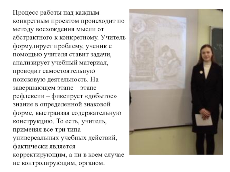 от абстрактного к конкретному. Учитель формулирует проблему, ученик с помощью учителя ставит задачи, анализирует учебный материал, проводит самостоятельную поисковую деятельность. На завершающем этапе – этапе рефлексии – фиксирует «добытое» знание в определенной знаковой форме, выстраивая содержательную конструкцию. То есть, учитель, применяя все три типа универсальных учебных действий, фактически является корректирующим, а ни в коем случае не контролирующим, органом.