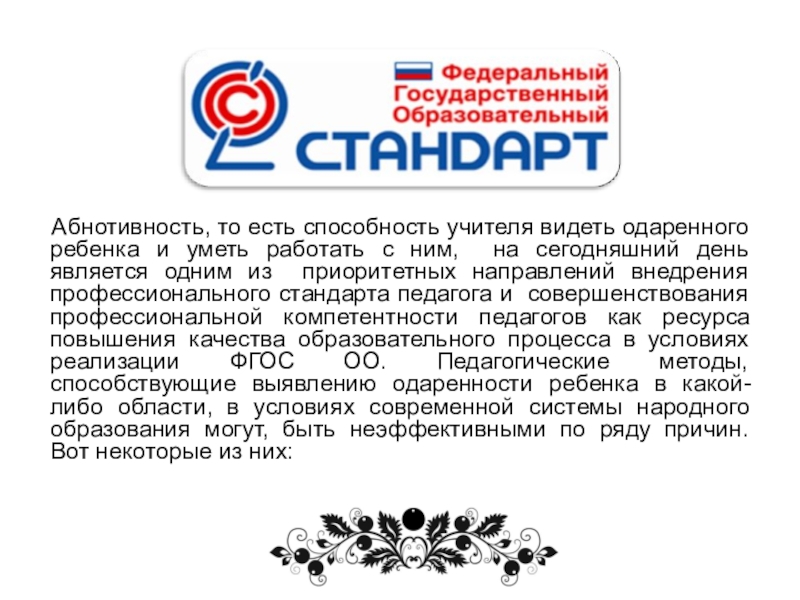 и уметь работать с ним, на сегодняшний день является одним из приоритетных направлений внедрения профессионального стандарта педагога и совершенствования профессиональной компетентности педагогов как ресурса повышения качества образовательного процесса в условиях реализации ФГОС ОО. Педагогические методы, способствующие выявлению одаренности ребенка в какой-либо области, в условиях современной системы народного образования могут, быть неэффективными по ряду причин. Вот некоторые из них: