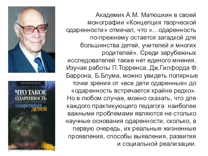 Слайд 6Академик А.М. Матюшкин в своей монографии «Концепция творческой одаренности» отмечал, что