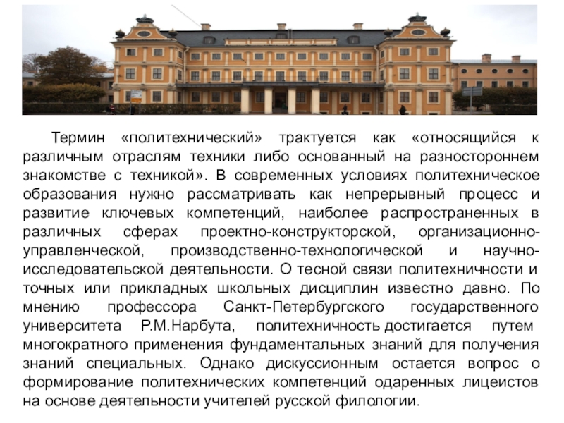 на разностороннем знакомстве с техникой». В современных условиях политехническое образования нужно рассматривать как непрерывный процесс и развитие ключевых компетенций, наиболее распространенных в различных сферах проектно-конструкторской, организационно-управленческой, производственно-технологической и научно-исследовательской деятельности. О тесной связи политехничности и точных или прикладных школьных дисциплин известно давно. По мнению профессора Санкт-Петербургского государственного университета Р.М.Нарбута, политехничность достигается путем многократного применения фундаментальных знаний для получения знаний специальных. Однако дискуссионным остается вопрос о формирование политехнических компетенций одаренных лицеистов на основе деятельности учителей русской филологии.
