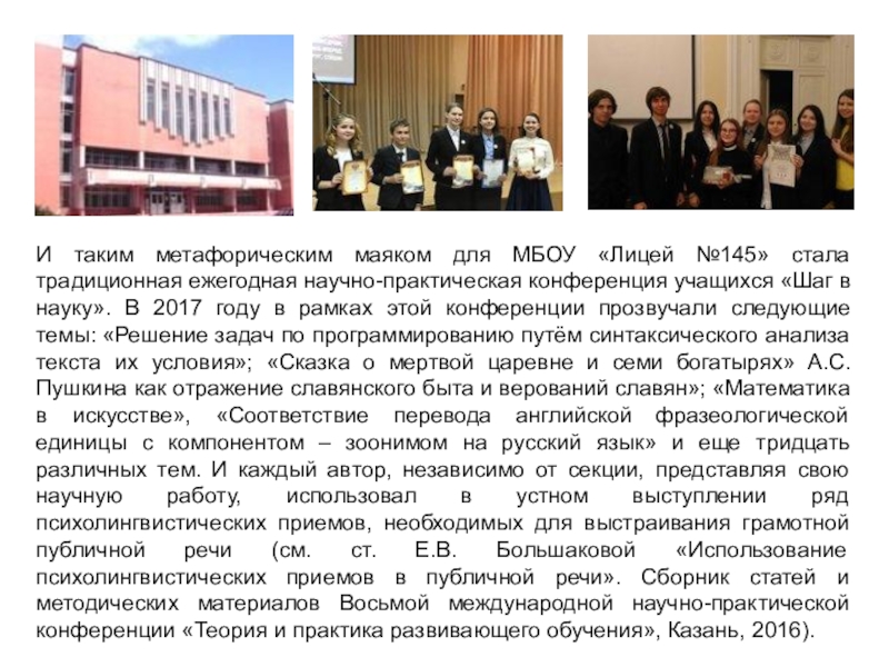 научно-практическая конференция учащихся «Шаг в науку». В 2017 году в рамках этой конференции прозвучали следующие темы: «Решение задач по программированию путём синтаксического анализа текста их условия»; «Сказка о мертвой царевне и семи богатырях» А.С.Пушкина как отражение славянского быта и верований славян»; «Математика в искусстве», «Соответствие перевода английской фразеологической единицы с компонентом – зоонимом на русский язык» и еще тридцать различных тем. И каждый автор, независимо от секции, представляя свою научную работу, использовал в устном выступлении ряд психолингвистических приемов, необходимых для выстраивания грамотной публичной речи (см. ст. Е.В. Большаковой «Использование психолингвистических приемов в публичной речи». Сборник статей и методических материалов Восьмой международной научно-практической конференции «Теория и практика развивающего обучения», Казань, 2016).