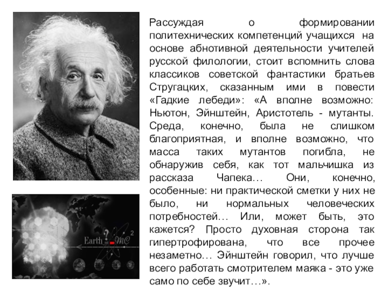 русской филологии, стоит вспомнить слова классиков советской фантастики братьев Стругацких, сказанным ими в повести «Гадкие лебеди»: «А вполне возможно: Ньютон, Эйнштейн, Аристотель - мутанты. Среда, конечно, была не слишком благоприятная, и вполне возможно, что масса таких мутантов погибла, не обнаружив себя, как тот мальчишка из рассказа Чапека… Они, конечно, особенные: ни практической сметки у них не было, ни нормальных человеческих потребностей… Или, может быть, это кажется? Просто духовная сторона так гипертрофирована, что все прочее незаметно… Эйнштейн говорил, что лучше всего работать смотрителем маяка - это уже само по себе звучит…».