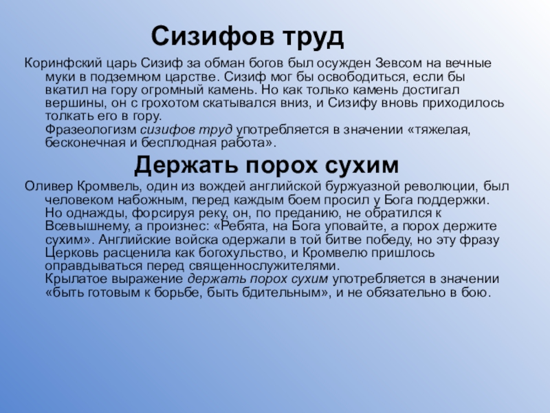 Оливер Кромвель, один из вождей английской буржуазной революции, был человеком набожным, перед каждым боем просил у Бога поддержки. Но однажды, форсируя реку, он, по преданию, не обратился к Всевышнему, а произнес: «Ребята, на Бога уповайте, а порох держите сухим». Английские войска одержали в той битве победу, но эту фразу Церковь расценила как богохульство, и Кромвелю пришлось оправдываться перед священнослужителями.
