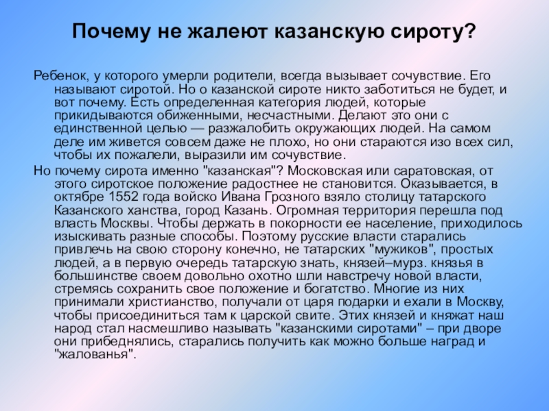 Но почему сирота именно "казанская"? Московская или саратовская, от этого сиротское положение радостнее не становится. Оказывается, в октябре 1552 года войско Ивана Грозного взяло столицу татарского Казанского ханства, город Казань. Огромная территория перешла под власть Москвы. Чтобы держать в покорности ее население, приходилось изыскивать разные способы. Поэтому русские власти старались привлечь на свою сторону конечно, не татарских "мужиков", простых людей, а в первую очередь татарскую знать, князей–мурз. князья в большинстве своем довольно охотно шли навстречу новой власти, стремясь сохранить свое положение и богатство. Многие из них принимали христианство, получали от царя подарки и ехали в Москву, чтобы присоединиться там к царской свите. Этих князей и княжат наш народ стал насмешливо называть "казанскими сиротами" – при дворе они прибеднялись, старались получить как можно больше наград и "жалованья".