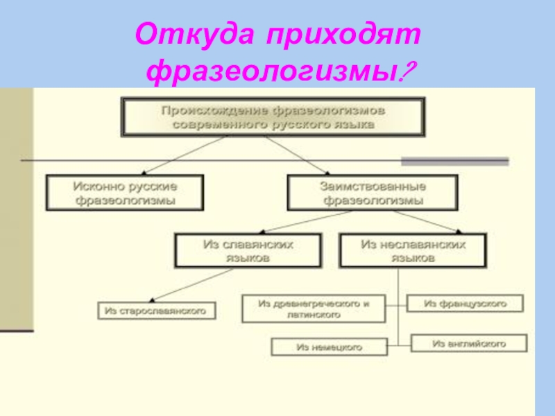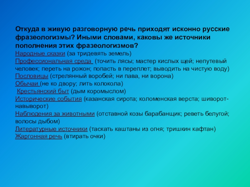 Слайд 6Откуда в живую разговорную речь приходят исконно русские фразеологизмы? Иными словами,