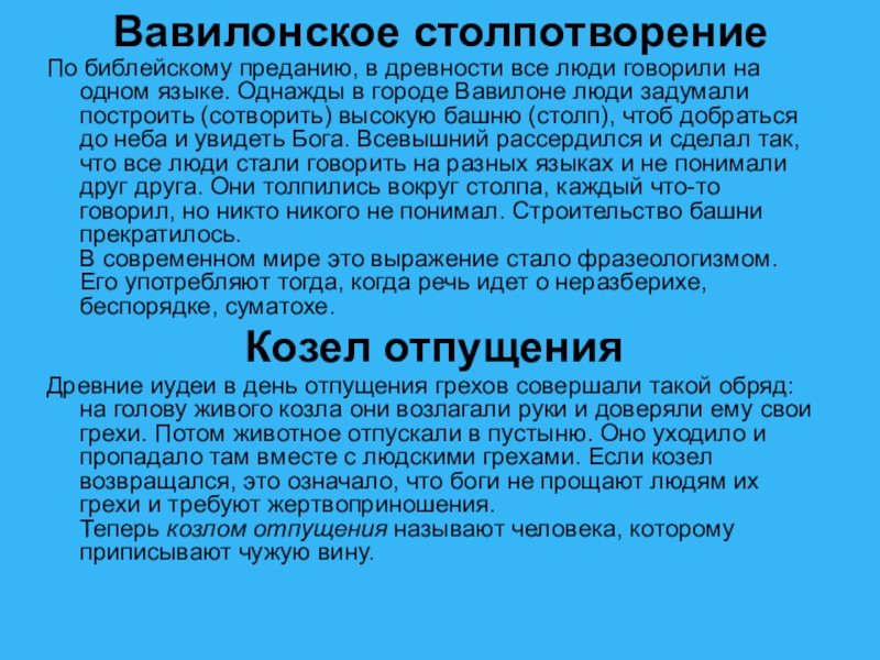 языке. Однажды в городе Вавилоне люди задумали построить (сотворить) высокую башню (столп), чтоб добраться до неба и увидеть Бога. Всевышний рассердился и сделал так, что все люди стали говорить на разных языках и не понимали друг друга. Они толпились вокруг столпа, каждый что-то говорил, но никто никого не понимал. Строительство башни прекратилось.