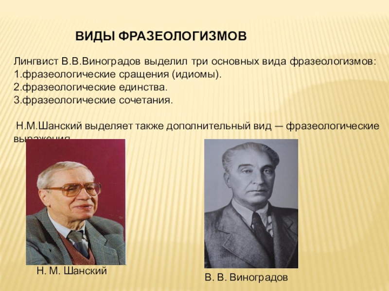 Лингвист В.В.Виноградов выделил три основных вида фразеологизмов:
