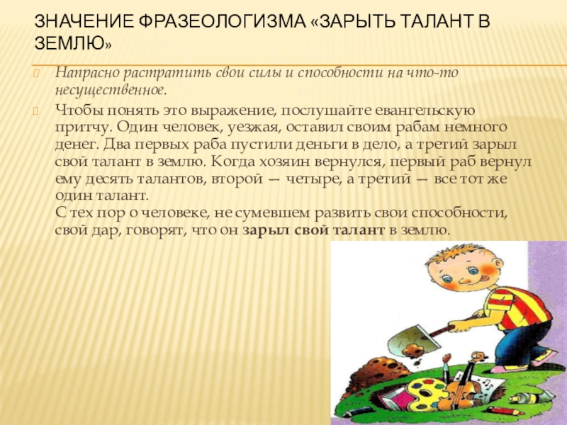 Слайд 9ЗНАЧЕНИЕ ФРАЗЕОЛОГИЗМА «ЗАРЫТЬ ТАЛАНТ В ЗЕМЛЮ»