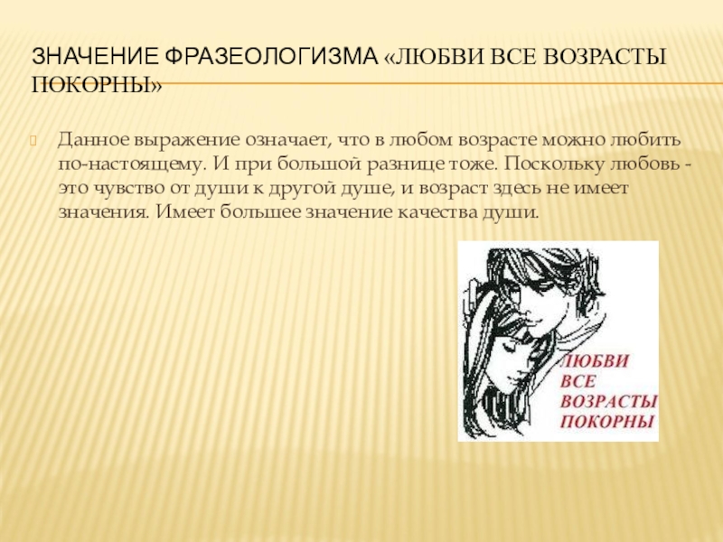 Слайд 13ЗНАЧЕНИЕ ФРАЗЕОЛОГИЗМА «ЛЮБВИ ВСЕ ВОЗРАСТЫ ПОКОРНЫ»