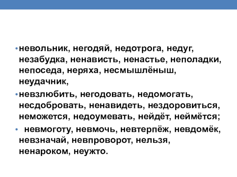 Слайд 11невольник, негодяй, недотрога, недуг, незабудка, ненависть, ненастье, неполадки, непоседа, неряха, несмышлёныш,
