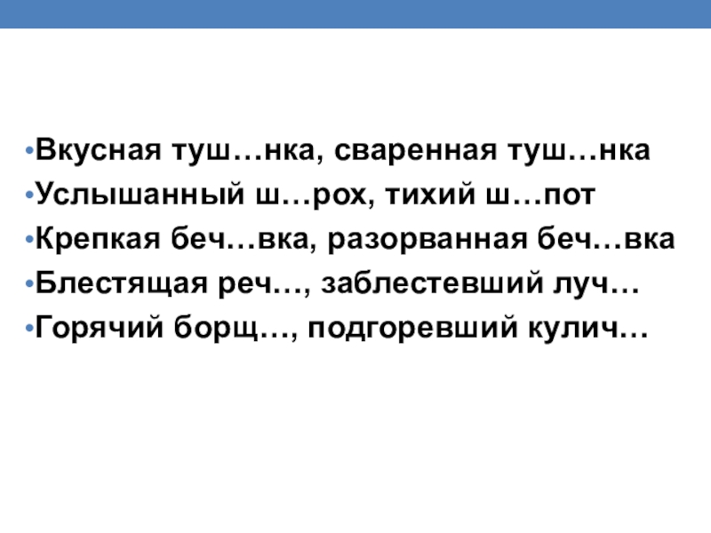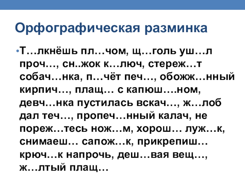 печ…, обожж…нный кирпич…, плащ… с капюш….ном, девч…нка пустилась вскач…, ж…лоб дал теч…, пропеч…нный калач, не пореж…тесь нож…м, хорош… луж…к, снимаеш… сапож…к, прикрепиш… крюч…к напрочь, деш…вая вещ…, ж…лтый плащ…