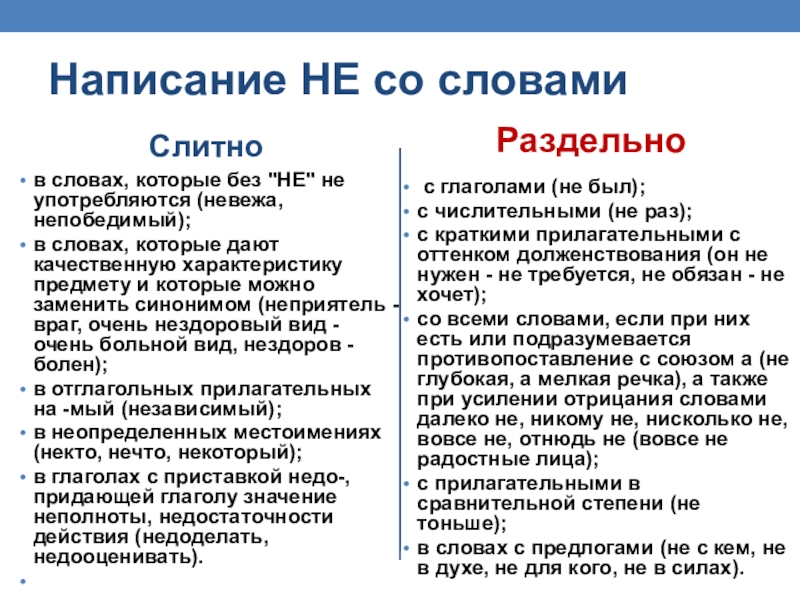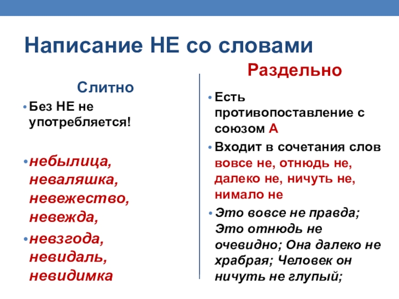 (Не)лепый поступок, (не)высоко взлететь; (не)высоко взлететь, а низко; поступить (не)по-товарищески, почуять (не)доброе, (не)ряшливый вид, вести себя (не)принужденно, вовсе (не)трудовые доходы, (не)веселый, а грустный вид, (не)складность фигуры, перейти (не)глубокую, но широкую реку, устать с (не)привычки, бормотать что-то (не)внятное, далеко (не)легкое дело, река была (не)широка, (не)противление злу, сказать явную (не)правду, юноша крайне (не)вежлив, (не)навистный человек, (не)движимость, (не)коммерческое, а государственное предприятие; (не)счастный случай, (не)трудоспособность, полный (не)вежда в музыке, (не)замужняя дама, (не)избежно, (не)приязненный, (не)совершеннолетние дети.