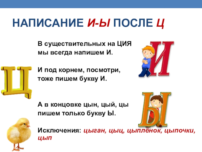 Исключения: цыган, цыц, цыплёнок, цыпочки, цып