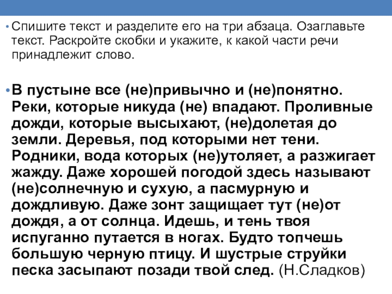 В пустыне все (не)привычно и (не)понятно. Реки, которые никуда (не) впадают. Проливные дожди, которые высыхают, (не)долетая до земли. Деревья, под которыми нет тени. Родники, вода которых (не)утоляет, а разжигает жажду. Даже хорошей погодой здесь называют (не)солнечную и сухую, а пасмурную и дождливую. Даже зонт защищает тут (не)от дождя, а от солнца. Идешь, и тень твоя испуганно путается в ногах. Будто топчешь большую черную птицу. И шустрые струйки песка засыпают позади твой след. (Н.Сладков)