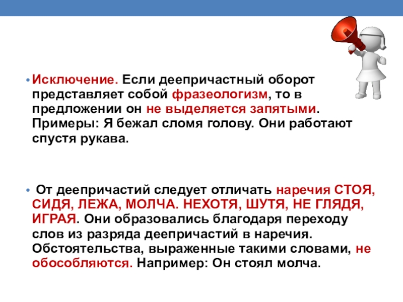 Слайд 5Исключение. Если деепричастный оборот представляет собой фразеологизм, то в предложении он