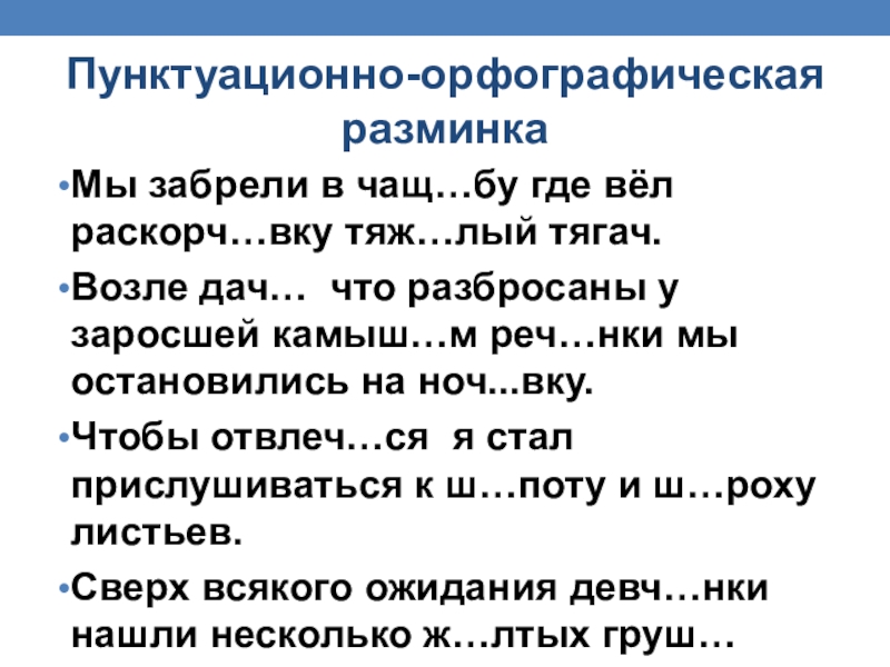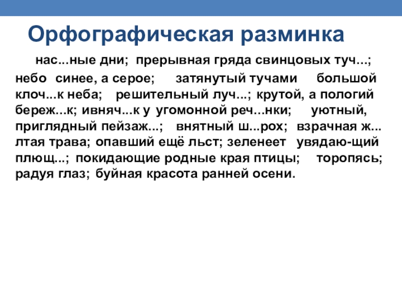 большой клоч...к неба; решительный луч...; крутой, а пологий береж...к; ивняч...к у угомонной реч...нки; уютный, приглядный пейзаж...; внятный ш...рох; взрачная ж...лтая трава; опавший ещё льст; зеленеет увядаю-щий плющ...; покидающие родные края птицы; торопясь; радуя глаз; буйная красота ранней осени.