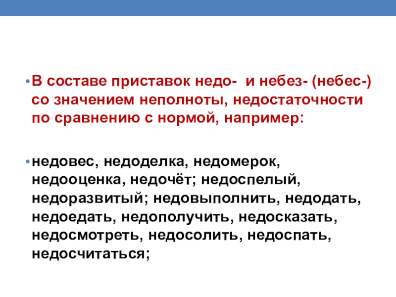 Слайд 12В составе приставок недо- и небез- (небес-) со значением неполноты, недостаточности