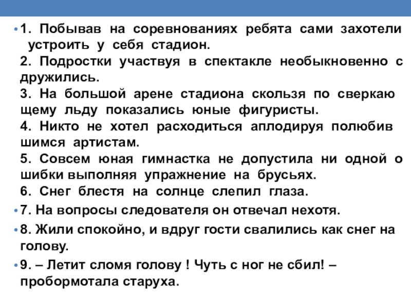 Слайд 61. Побывав на соревнованиях ребята сами захотели устроить у себя стадион. 2. Подростки участвуя в спектакле необыкновенно сдружились. 3. На большой арене стадиона скользя по сверкающему льду показались юные фигуристы. 4. Никто не хотел расходиться аплодируя полюбившимся артистам. 5. Совсем юная гимнастка не допустила ни одной ошибки выполняя упражнение на брусьях. 6. Снег блестя на солнце слепил глаза.