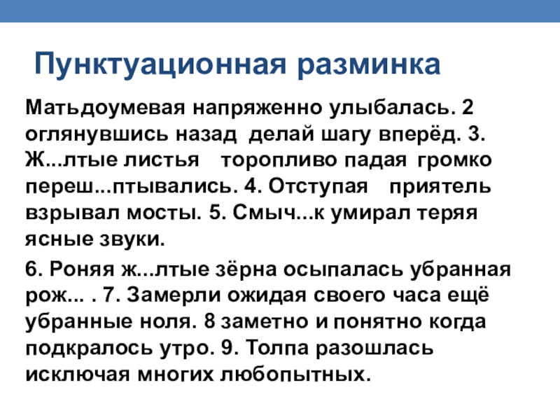 6. Роняя ж...лтые зёрна осыпалась убранная рож... . 7. Замерли ожидая своего часа ещё убранные ноля. 8 заметно и понятно когда подкралось утро. 9. Толпа разошлась исключая многих любопытных.