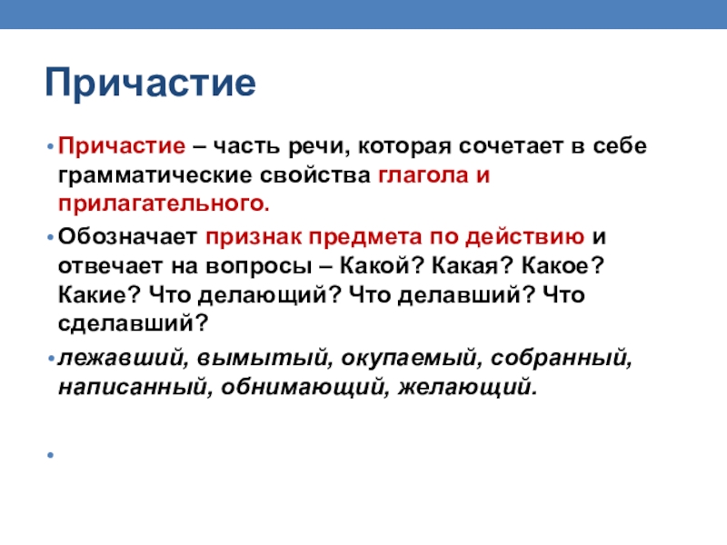 Причастие – часть речи, которая сочетает в себе грамматические свойства глагола