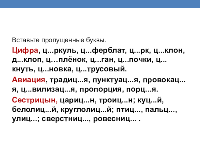 Авиация, традиц...я, пунктуац...я, провокац...я, ц...вилизац...я, пропорция, порц...я.