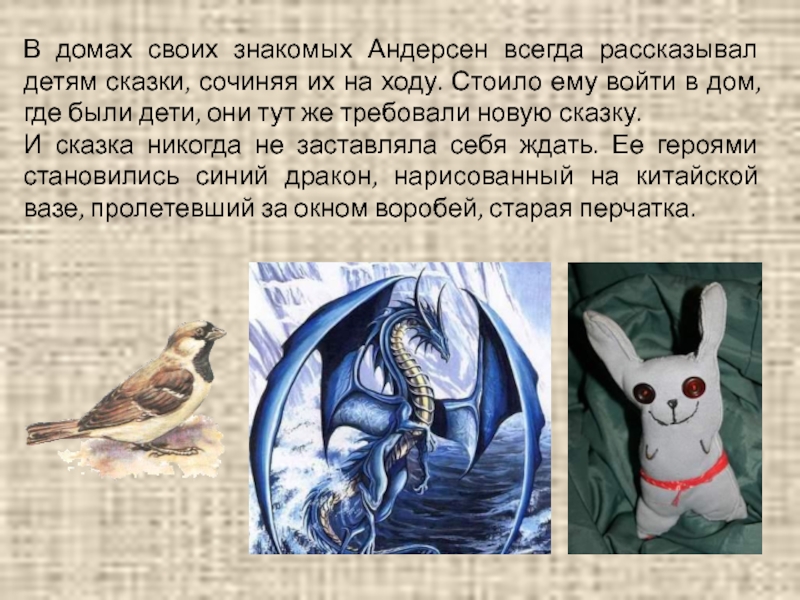 И сказка никогда не заставляла себя ждать. Ее героями становились синий дракон, нарисованный на китайской вазе, пролетевший за окном воробей, старая перчатка.