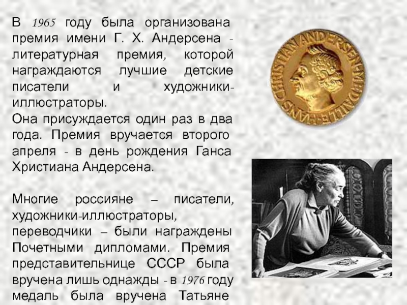 Слайд 12В 1965 году была организована премия имени Г. Х. Андерсена -