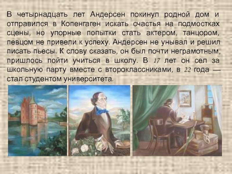 искать счастья на подмостках сцены, но упорные попытки стать актером, танцором, певцом не привели к успеху. Андерсен не унывал и решил писать пьесы. К слову сказать, он был почти неграмотным, пришлось пойти учиться в школу. В 17 лет он сел за школьную парту вместе с второклассниками, в 22 года — стал студентом университета.