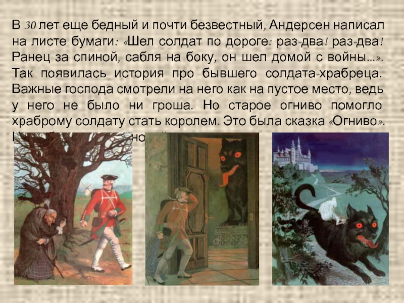 листе бумаги: «Шел солдат по дороге: раз-два! раз-два! Ранец за спиной, сабля на боку, он шел домой с войны...». Так появилась история про бывшего солдата-храбреца. Важные господа смотрели на него как на пустое место, ведь у него не было ни гроша. Но старое огниво помогло храброму солдату стать королем. Это была сказка «Огниво». И это было начало новой жизни.