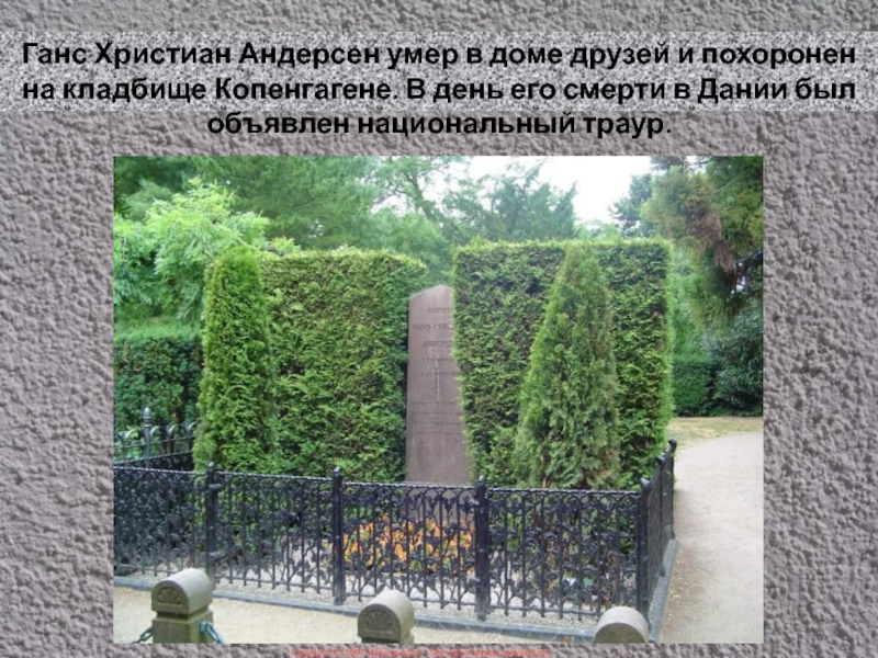 Слайд 11Ганс Христиан Андерсен умер в доме друзей и похоронен на кладбище