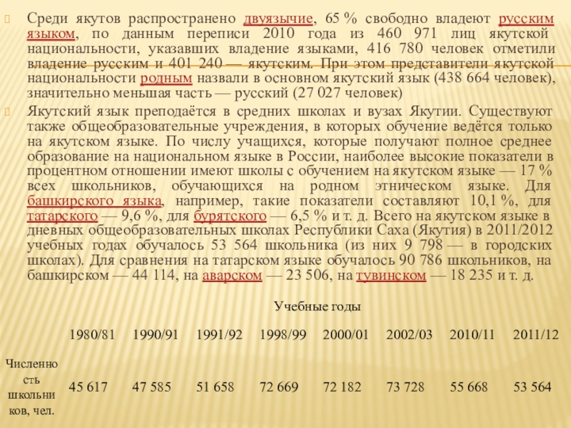 Слайд 20Среди якутов распространено двуязычие, 65 % свободно владеют русским языком, по данным