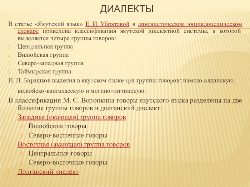 В классификации М. С. Воронкина говоры якутского языка разделены на две большие группы говоров и долганский диалект: