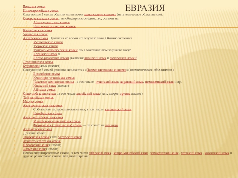 Евразия: всего 21 семья, 4 изолята и 12 неклассифицированных языков.
