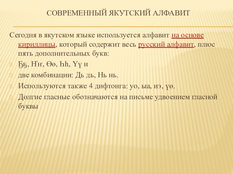 Сегодня в якутском языке используется алфавит на основе кириллицы,
