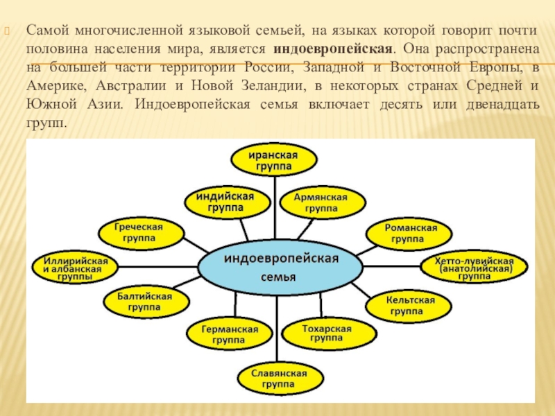 мира, является индоевропейская. Она распространена на большей части территории России, Западной и Восточной Европы, в Америке, Австралии и Новой Зеландии, в некоторых странах Средней и Южной Азии. Индоевропейская семья включает десять или двенадцать групп.
