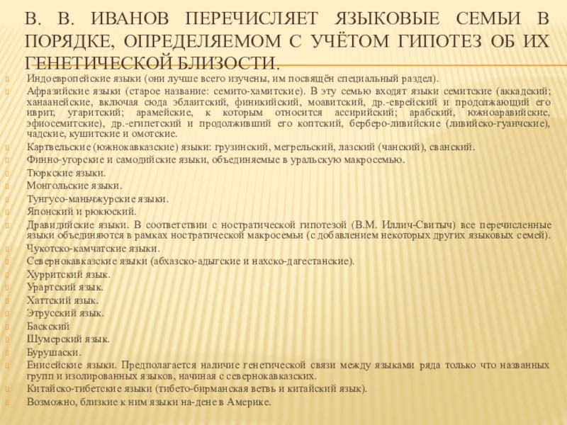 Слайд 9В. В. Иванов перечисляет языковые семьи в порядке, определяемом с учётом