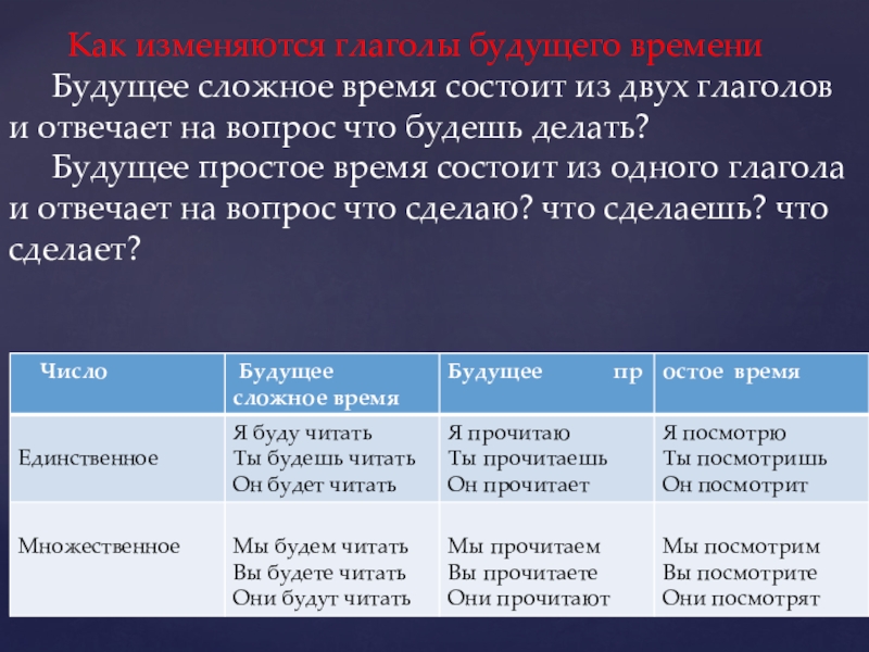 Глаголы будущего времени отвечают на вопросы что будет ( –ут) делать? или что сделает (–ют?) Например: Завтра я буду читать. Он будет играть.