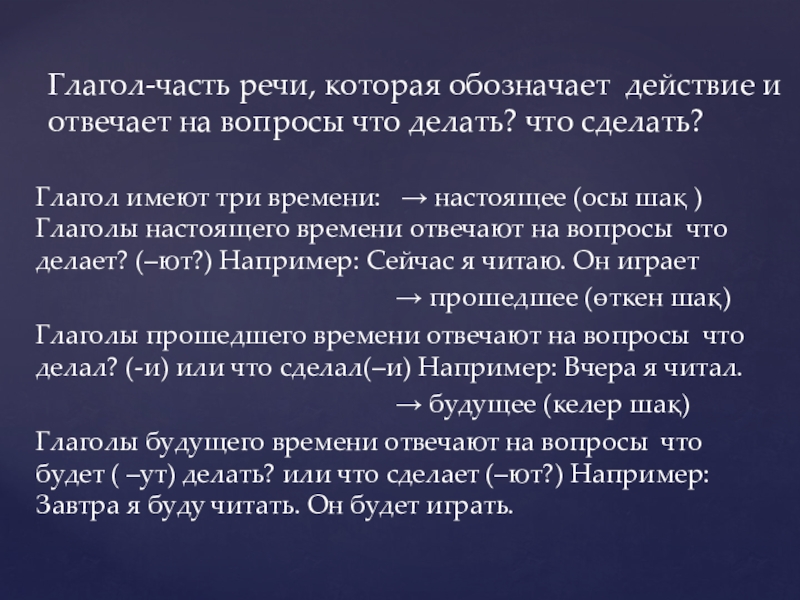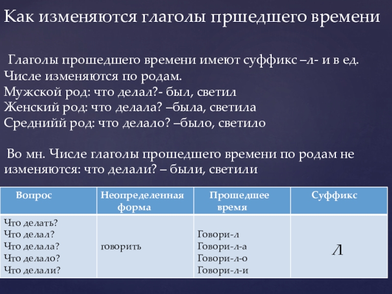 Глаголы прошедшего времени отвечают на вопросы что делал? (-и) или что сделал(–и) Например: Вчера я читал.