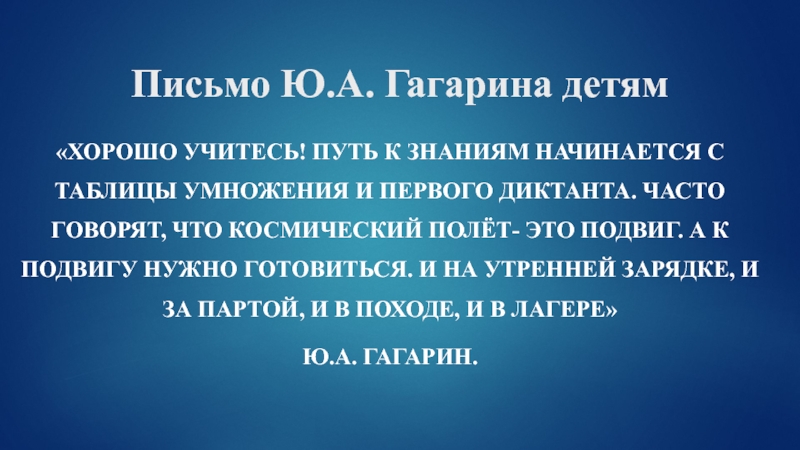 умножения и первого диктанта. Часто говорят, что космический полёт- это подвиг. А к подвигу нужно готовиться. И на утренней зарядке, и за партой, и в походе, и в лагере»