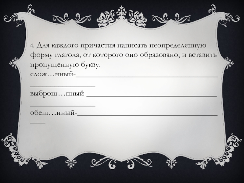 Слайд 114. Для каждого причастия написать неопределенную форму глагола, от которого оно