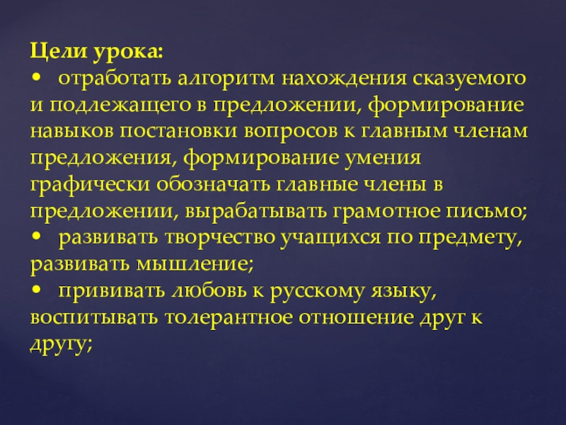 Цели урока:• отработать алгоритм нахождения сказуемого и подлежащего в предложении, формирование навыков постановки вопросов к главным членам предложения, формирование умения графически обозначать главные члены в предложении, вырабатывать грамотное письмо;• развивать творчество учащихся по предмету, развивать мышление;• прививать любовь к