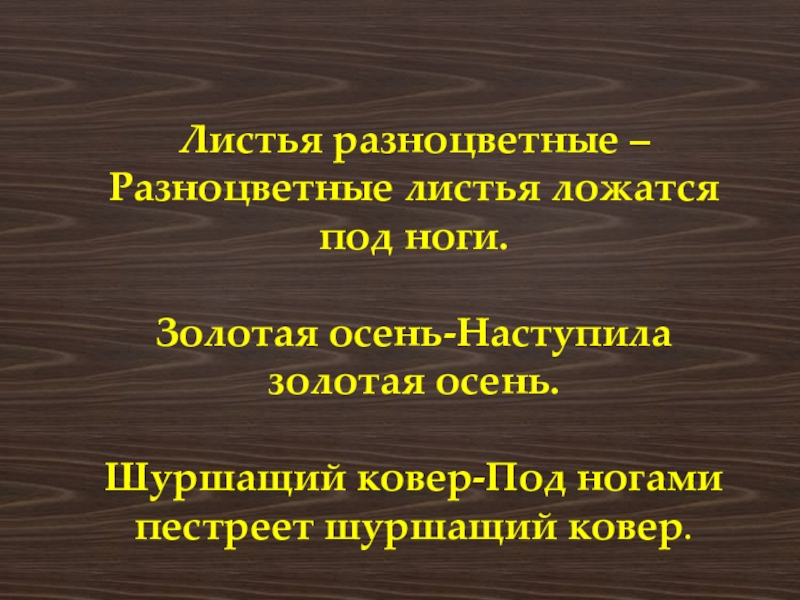 Слайд 5Листья разноцветные – Разноцветные листья ложатся под ноги. Золотая осень-Наступила золотая осень. Шуршащий